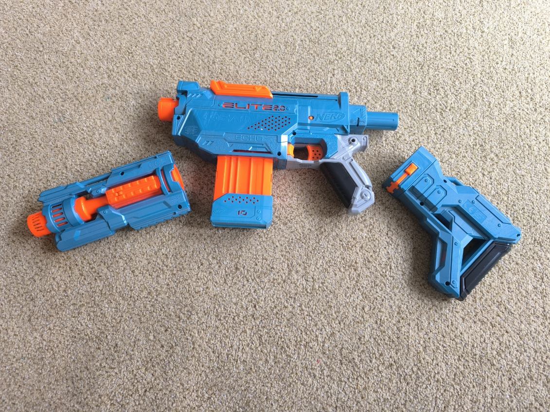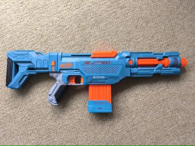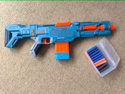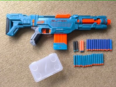 Plně funkční pistole Nerf Elite Echo + 32 nábojů a krabička IKEA :-) Jsme první majitelé.